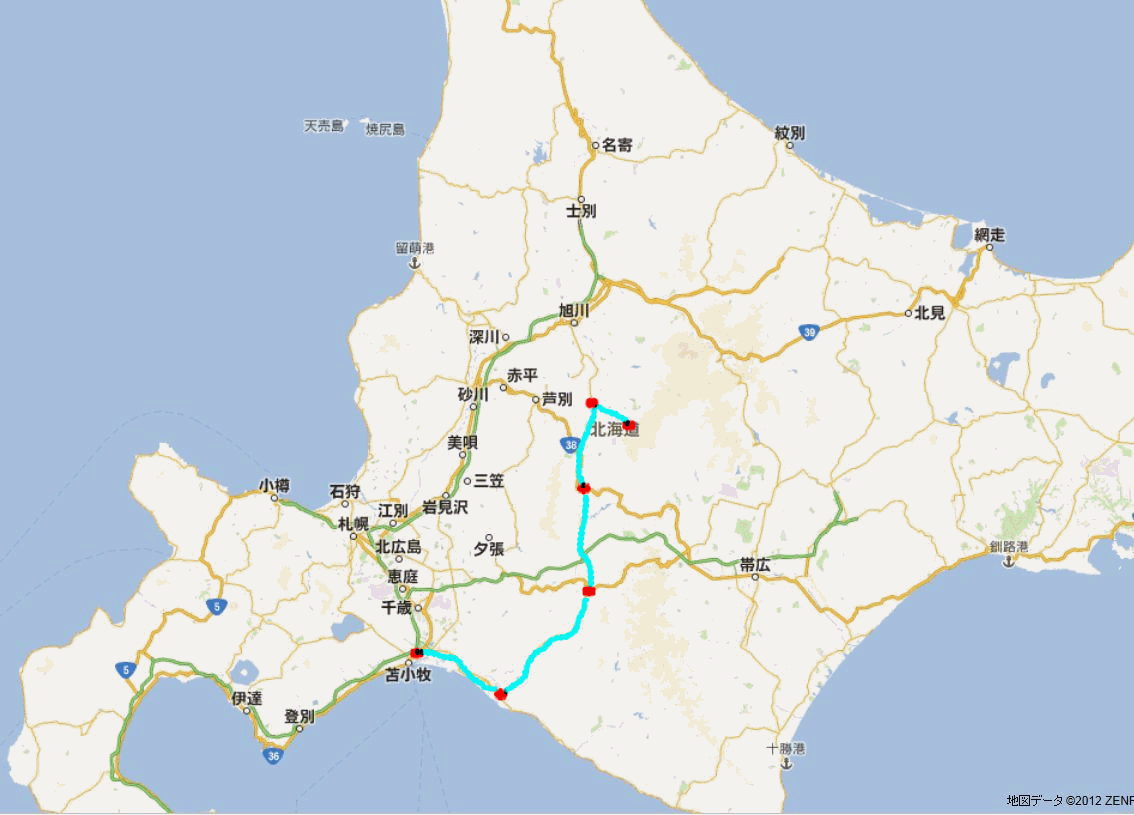 十勝岳温泉〜富良野〜占冠〜日高〜平取〜苫小牧港(フェリー泊)--大洗港〜自宅